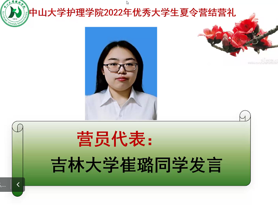 营员代表崔璐说:“在各位老师讲解与介绍中,我们领略了中山大学人文情怀,感受到了中山大学深厚的历史底蕴,也体会到浓郁的学术氛围和蓬勃的发展力。而我,更是被中山大学强大包容性深深吸引。在各位导师精彩的讲座中,我感受到护理学极具发展潜力,了解了护理前沿发展,感受到多学科交叉合作的魅力。每一位导师都在自己的研究领域大放异彩,推动护理事业的蓬勃的发展,我也为老师们的执着追求和创新钻研精神所折服。”